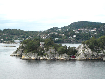 Sailing out to the North Sea from Bergen was very scenic. There are so many islands varying in size from a rock pile to large islands that it reminded me of the 1000 Islands in the St. Lawrence River. Many of the islands had elaborate houses with pools, boathouses, and protected docks. We sailed under two bridges that our ship can only clear at low tide. It took us two hours to clear the islands and enter the North Sea.