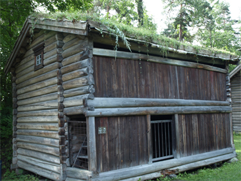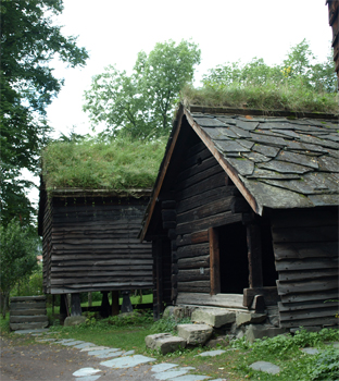 The farmhouses were mostly one room with a table and bench that went the length of the room, a hearth either in the middle of the room with a hole in the roof for the smoke or, later, in the corner with a chimney. There was a bed for the children and usually a large decorative cabinet on one wall. It was a functional room for several people. These houses and barns were built very similar to those we saw in the restored village of Mandrogy in Russia. The storehouses looked like caches used by the Inuit people of Alaska. The barns were two-stories - animals on the ground level with a ramp of dirt and wood to a second floor for the carts and sleds. Many of the buildings had roofs with birch bark waterproofing under thick turf just like in Iceland. Most of the buildings were made of large tree timbers and had decorative carving in some panels. Stairs were chiseled out of huge tree trunks. The fences for the animals or gardens were slanted slats held between two poles. I guess it served as a wind/snow break as well as a fence.