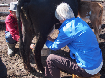 Gale trying her hand at milking |