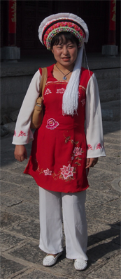 Traditional Bai dress She wears a red pinafore over white sleeves and slacks. The red color means she is less than 40 years old. From 40 to age 70 women wear blue and after 70, a very dark blue. Her headdress tells several stories. If the thick white tassel is long, she is single. When a boy touches her tassel it is part of their engagement process. Lisa is married, so her tassel is shorter. If her husband dies, it is cut off even shorter. The tassel hangs on the left side meaning she used her father's surname. If it is on the right side, the girl uses her mother's name, perhaps because she has no brothers to carry on the family name.